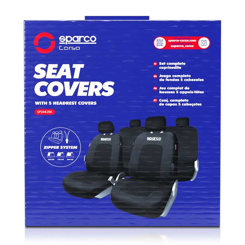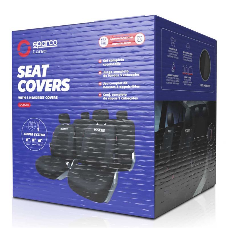 Fantástico juego completo de fundas de asiento para coche Sparco modelo Sport en color negro. Juego completo de fundas y 5 cabezales.